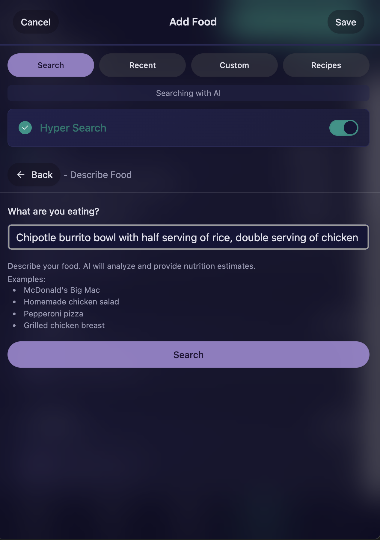 Leveraging the power of AI, users can describe their meals using natural language, and accurate nutrition data will be returned to the app so the user can track their meal.